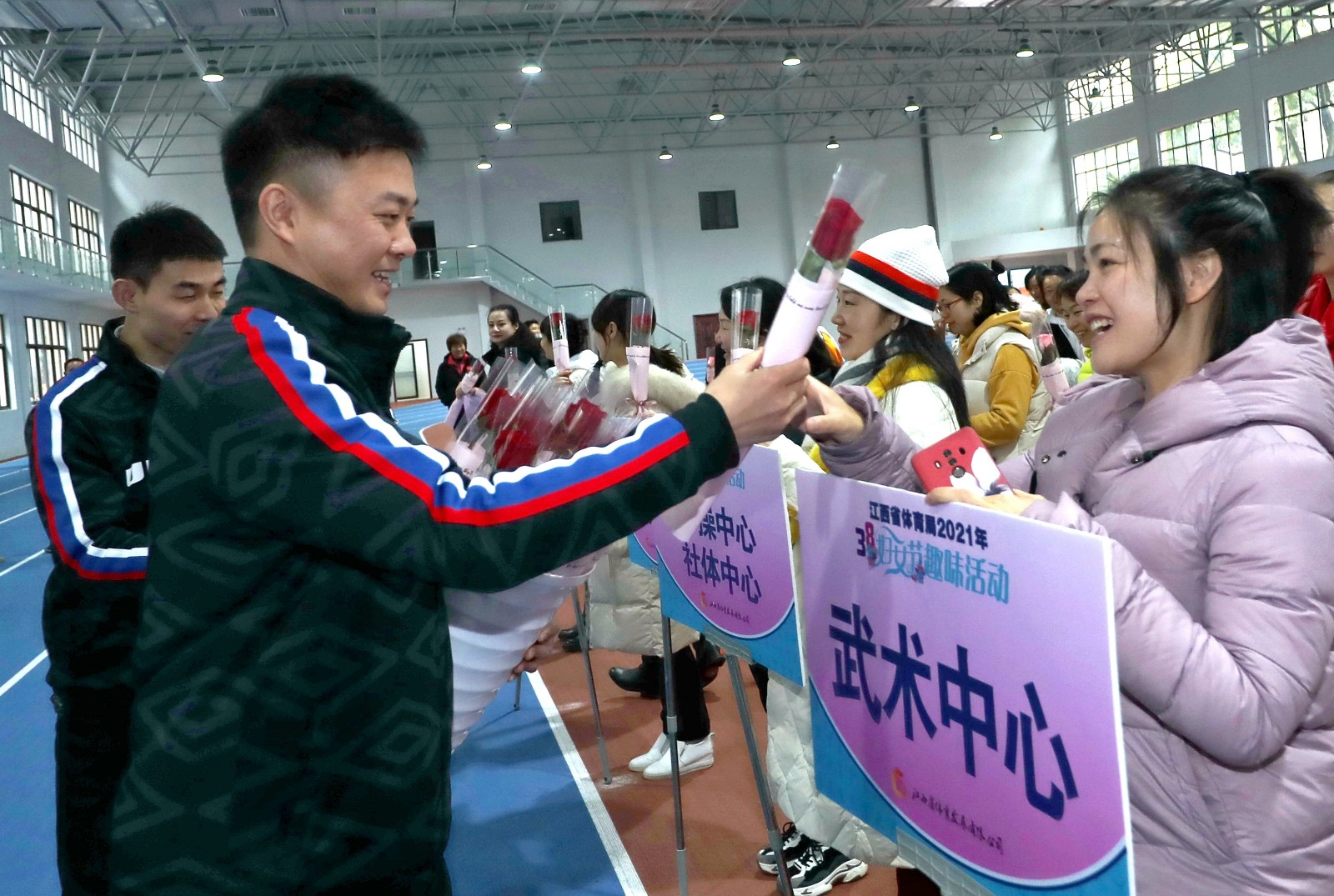 趣味賽特設(shè)暖男獻(xiàn)花環(huán)節(jié),為每一位參賽者送上鮮花,感謝她們一年來(lái)辛勤付出,為江西體育事業(yè)發(fā)展做出了積極貢獻(xiàn)。本次三八節(jié)趣味賽拓寬了省體育系統(tǒng)女干部職工的業(yè)余文化生活,團(tuán)結(jié)引領(lǐng)廣大女干部職工立足崗位、爭(zhēng)創(chuàng)一流,以更加飽滿的熱情參與江西體育事業(yè)大發(fā)展。